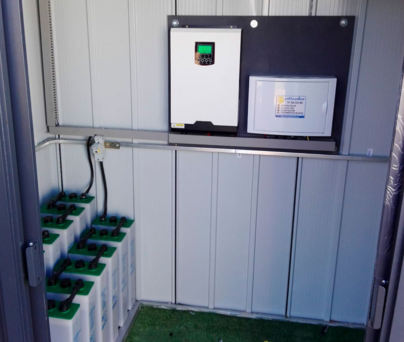 El inversor lo que hace es, cuando las baterías han almacenado suficiente energía, coger la necesaria y transformarla corriente alterna.